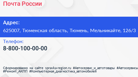 Почта России по адресу 625007, Тюменская область, Тюмень, Мельникайте, 126/3 в дальнейшем Организация, размещена в следующих категориях: