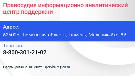 Правосудие, информационно-аналитический центр поддержки по адресу 625026, Тюменская область, Тюмень, Мельникайте, 99 в дальнейшем Организация, размещена в следующих категориях: