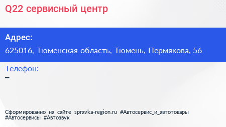 Q22, сервисный центр по адресу 625016, Тюменская область, Тюмень, Пермякова, 56 в дальнейшем Организация, размещена в следующих категориях: