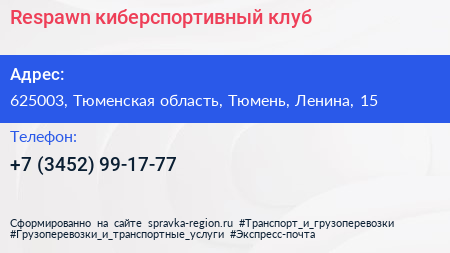 Respawn, киберспортивный клуб по адресу 625003, Тюменская область, Тюмень, Ленина, 15 в дальнейшем Организация, размещена в следующих категориях: