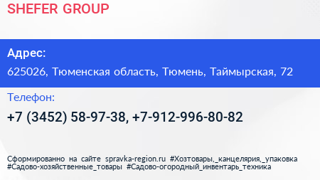 SHEFER GROUP по адресу 625026, Тюменская область, Тюмень, Таймырская, 72 в дальнейшем Организация, размещена в следующих категориях: