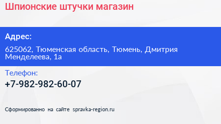 Шпионские штучки, магазин по адресу 625062, Тюменская область, Тюмень, Дмитрия Менделеева, 1а в дальнейшем Организация, размещена в следующих категориях:
