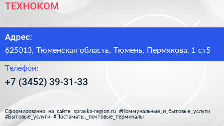ТЕХНОКОМ по адресу 625013, Тюменская область, Тюмень, Пермякова, 1 ст5 в дальнейшем Организация, размещена в следующих категориях: