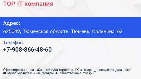 TOP-IT, компания по адресу 625049, Тюменская область, Тюмень, Калинина, 62 в дальнейшем Организация, размещена в следующих категориях: