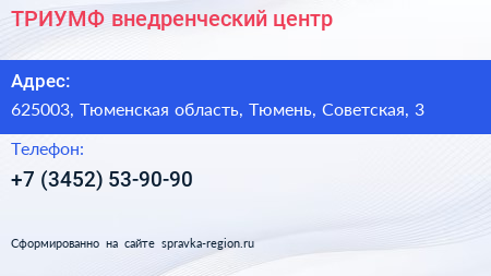 ТРИУМФ, внедренческий центр по адресу 625003, Тюменская область, Тюмень, Советская, 3 в дальнейшем Организация, размещена в следующих категориях: