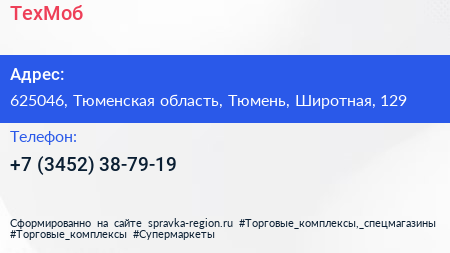 ТехМоб по адресу 625046, Тюменская область, Тюмень, Широтная, 129 в дальнейшем Организация, размещена в следующих категориях:
