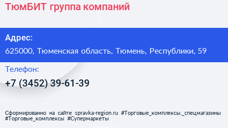 ТюмБИТ, группа компаний по адресу 625000, Тюменская область, Тюмень, Республики, 59 в дальнейшем Организация, размещена в следующих категориях:
