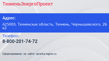 ТюменьЭнергоПроект по адресу 625003, Тюменская область, Тюмень, Чернышевского, 2Б к2 в дальнейшем Организация, размещена в следующих категориях:
