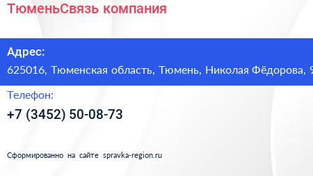 ТюменьСвязь, компания по адресу 625016, Тюменская область, Тюмень, Николая Фёдорова, 9 в дальнейшем Организация, размещена в следующих категориях: