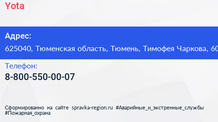 Yota по адресу 625040, Тюменская область, Тюмень, Тимофея Чаркова, 60 в дальнейшем Организация, размещена в следующих категориях: