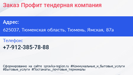 Заказ-Профит, тендерная компания по адресу 625037, Тюменская область, Тюмень, Ямская, 87а в дальнейшем Организация, размещена в следующих категориях: