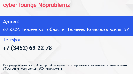 cyber lounge Noproblemz по адресу 625002, Тюменская область, Тюмень, Комсомольская, 57 в дальнейшем Организация, размещена в следующих категориях:
