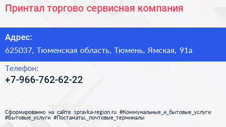 Принтал, торгово-сервисная компания по адресу 625037, Тюменская область, Тюмень, Ямская, 91а в дальнейшем Организация, размещена в следующих категориях: