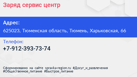 Заряд, сервис-центр по адресу 625023, Тюменская область, Тюмень, Харьковская, 66 в дальнейшем Организация, размещена в следующих категориях: