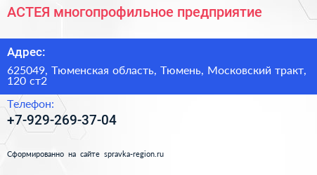 АСТЕЯ, многопрофильное предприятие по адресу 625049, Тюменская область, Тюмень, Московский тракт, 120 ст2 в дальнейшем Организация, размещена в следующих категориях: