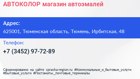 АВТОКОЛОР, магазин автоэмалей по адресу 625001, Тюменская область, Тюмень, Ирбитская, 48 в дальнейшем Организация, размещена в следующих категориях: