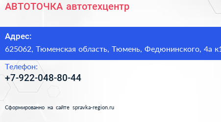 АВТОТОЧКА, автотехцентр по адресу 625062, Тюменская область, Тюмень, Федюнинского, 4а к1 в дальнейшем Организация, размещена в следующих категориях: