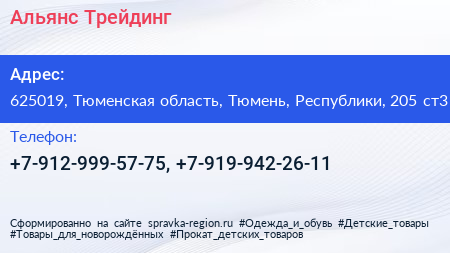 Альянс Трейдинг по адресу 625019, Тюменская область, Тюмень, Республики, 205 ст3 в дальнейшем Организация, размещена в следующих категориях: