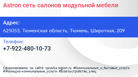 Astron, сеть салонов модульной мебели по адресу 625053, Тюменская область, Тюмень, Широтная, 209 в дальнейшем Организация, размещена в следующих категориях: