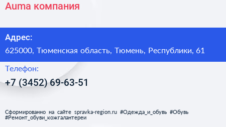 Для связи с организацией воспользуйтесь номером телефона: +7 (3452) 69-63-51. Пн: c 09:00-13:00, Вт: c 09:00-13:00, Ср: c 09:00-13:00, Чт: c 09:00-13:00, Пт: c 09:00-13:00, Сб: выходной, Вс: выходной, вы можете обратиться в эту организацию.