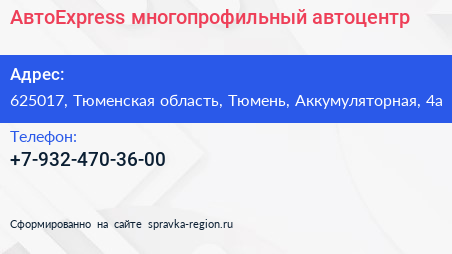АвтоExpress, многопрофильный автоцентр по адресу 625017, Тюменская область, Тюмень, Аккумуляторная, 4а в дальнейшем Организация, размещена в следующих категориях: