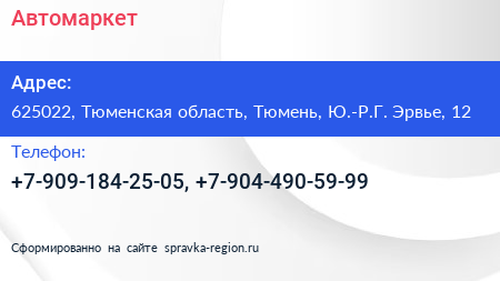Автомаркет по адресу 625022, Тюменская область, Тюмень, Ю.-Р.Г. Эрвье, 12 в дальнейшем Организация, размещена в следующих категориях:
