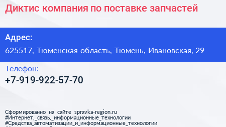 Диктис, компания по поставке запчастей по адресу 625517, Тюменская область, Тюмень, Ивановская, 29 в дальнейшем Организация, размещена в следующих категориях: