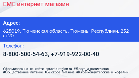 ЕМЕ, интернет-магазин по адресу 625019, Тюменская область, Тюмень, Республики, 252 ст20 в дальнейшем Организация, размещена в следующих категориях: