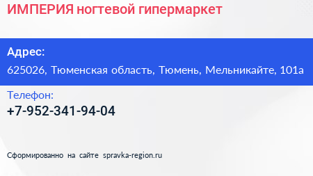 ИМПЕРИЯ, ногтевой гипермаркет по адресу 625026, Тюменская область, Тюмень, Мельникайте, 101а в дальнейшем Организация, размещена в следующих категориях:
