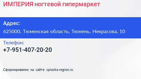 ИМПЕРИЯ, ногтевой гипермаркет по адресу 625000, Тюменская область, Тюмень, Некрасова, 10 в дальнейшем Организация, размещена в следующих категориях: