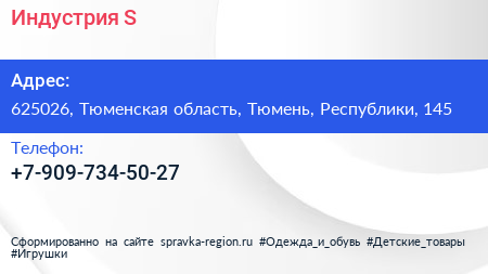 Индустрия-S по адресу 625026, Тюменская область, Тюмень, Республики, 145 в дальнейшем Организация, размещена в следующих категориях: