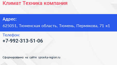 Климат Техника, компания по адресу 625051, Тюменская область, Тюмень, Пермякова, 71 к1 в дальнейшем Организация, размещена в следующих категориях: