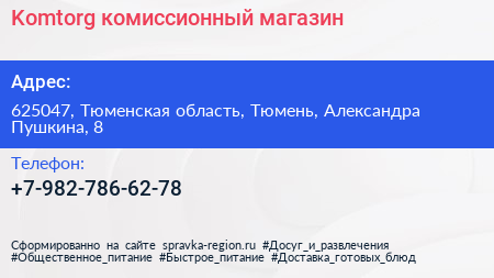 Komtorg, комиссионный магазин по адресу 625047, Тюменская область, Тюмень, Александра Пушкина, 8 в дальнейшем Организация, размещена в следующих категориях: