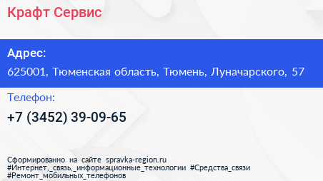 Крафт-Сервис по адресу 625001, Тюменская область, Тюмень, Луначарского, 57 в дальнейшем Организация, размещена в следующих категориях: