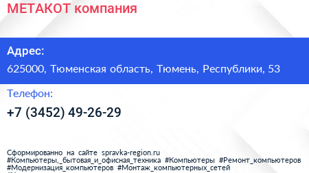 МЕТАКОТ, компания по адресу 625000, Тюменская область, Тюмень, Республики, 53 в дальнейшем Организация, размещена в следующих категориях: