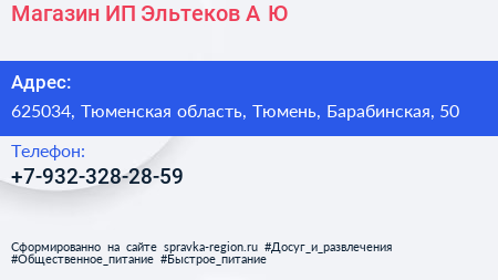 Магазин, ИП Эльтеков А.Ю. по адресу 625034, Тюменская область, Тюмень, Барабинская, 50 в дальнейшем Организация, размещена в следующих категориях: