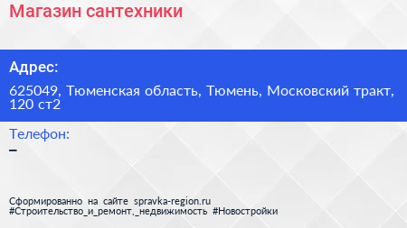 Магазин сантехники по адресу 625049, Тюменская область, Тюмень, Московский тракт, 120 ст2 в дальнейшем Организация, размещена в следующих категориях: