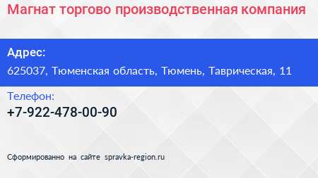 Магнат, торгово-производственная компания по адресу 625037, Тюменская область, Тюмень, Таврическая, 11 в дальнейшем Организация, размещена в следующих категориях: