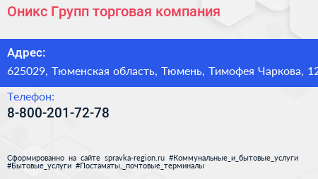 Оникс Групп, торговая компания по адресу 625029, Тюменская область, Тюмень, Тимофея Чаркова, 12 в дальнейшем Организация, размещена в следующих категориях: