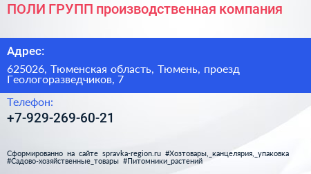 ПОЛИ-ГРУПП, производственная компания по адресу 625026, Тюменская область, Тюмень, проезд Геологоразведчиков, 7 в дальнейшем Организация, размещена в следующих категориях: