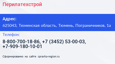 Перилатехстрой по адресу 625043, Тюменская область, Тюмень, Пограничников, 1а в дальнейшем Организация, размещена в следующих категориях: