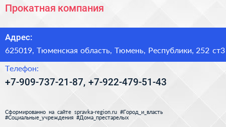 Прокатная компания по адресу 625019, Тюменская область, Тюмень, Республики, 252 ст3 в дальнейшем Организация, размещена в следующих категориях: