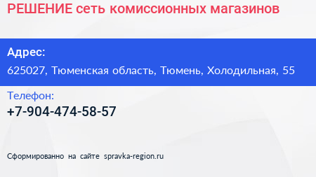 РЕШЕНИЕ, сеть комиссионных магазинов по адресу 625027, Тюменская область, Тюмень, Холодильная, 55 в дальнейшем Организация, размещена в следующих категориях: