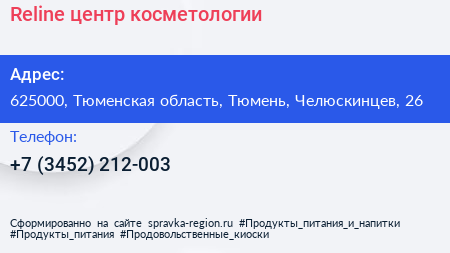 Reline, центр косметологии по адресу 625000, Тюменская область, Тюмень, Челюскинцев, 26 в дальнейшем Организация, размещена в следующих категориях:
