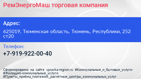 РемЭнергоМаш, торговая компания по адресу 625019, Тюменская область, Тюмень, Республики, 252 ст20 в дальнейшем Организация, размещена в следующих категориях:
