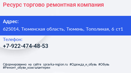 Ресурс, торгово-ремонтная компания по адресу 625014, Тюменская область, Тюмень, Тополиная, 6 ст1 в дальнейшем Организация, размещена в следующих категориях: