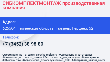 СИБКОМПЛЕКТМОНТАЖ, производственная компания по адресу 625504, Тюменская область, Тюмень, Герцена, 52 в дальнейшем Организация, размещена в следующих категориях: