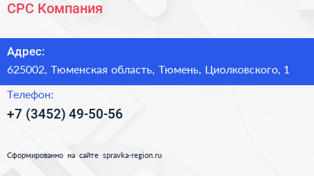 СРС, Компания по адресу 625002, Тюменская область, Тюмень, Циолковского, 1 в дальнейшем Организация, размещена в следующих категориях: