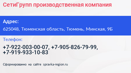 СетиГрупп, производственная компания по адресу 625048, Тюменская область, Тюмень, Минская, 9Б в дальнейшем Организация, размещена в следующих категориях: