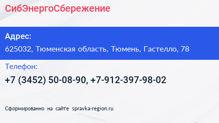 СибЭнергоСбережение по адресу 625032, Тюменская область, Тюмень, Гастелло, 78 в дальнейшем Организация, размещена в следующих категориях: